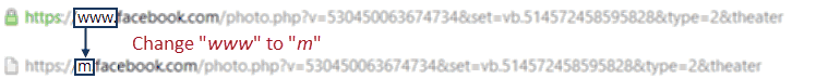 - Just change the “www” to “m“. Then the URL will look like “https://m.facebook.com/photo.php?v=530450063674734&set=vb.514572458595828&type=2&theater“. Changing this will open the Facebook mobile website.